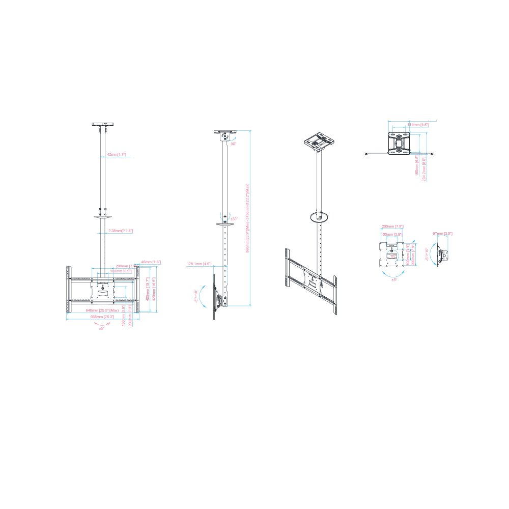 The Ceiling Mount Bracket is a versatile and durable solution for securely mounting flat panel displays in a range of environments, including commercial and residential settings. With adjustable height, tilt, and swivel capabilities, it ensures optimal viewing angles and flexibility for your display setup. Its robust design accommodates various display sizes and provides a sleek and professional appearance.