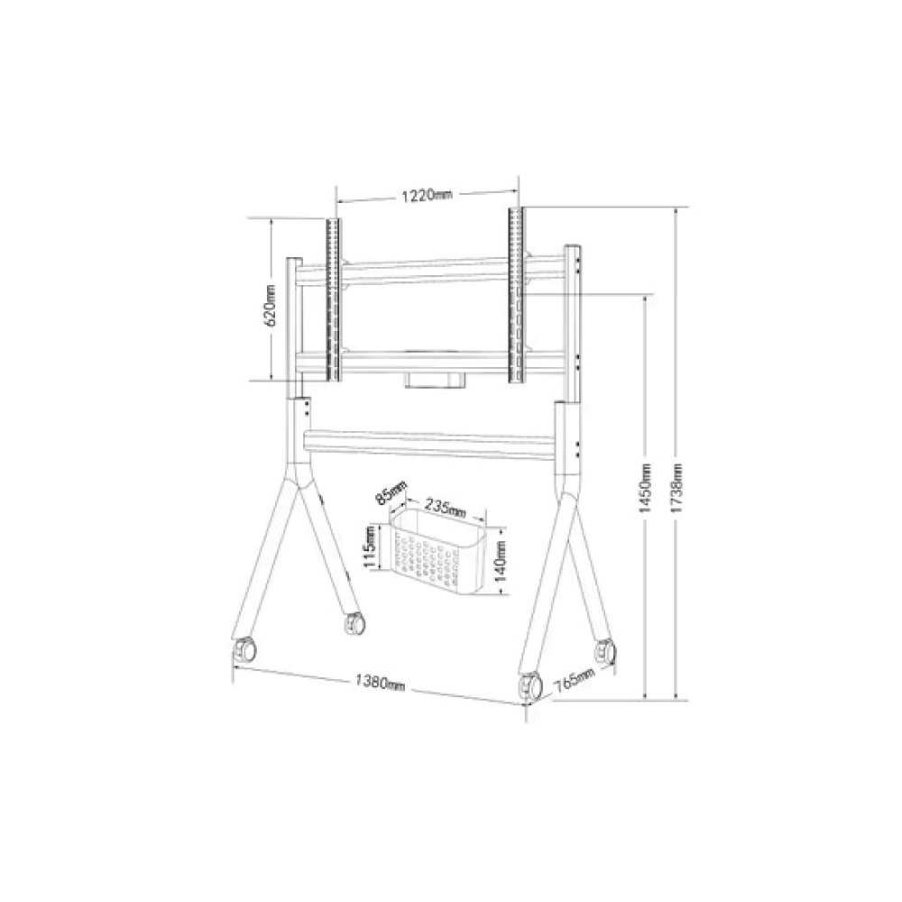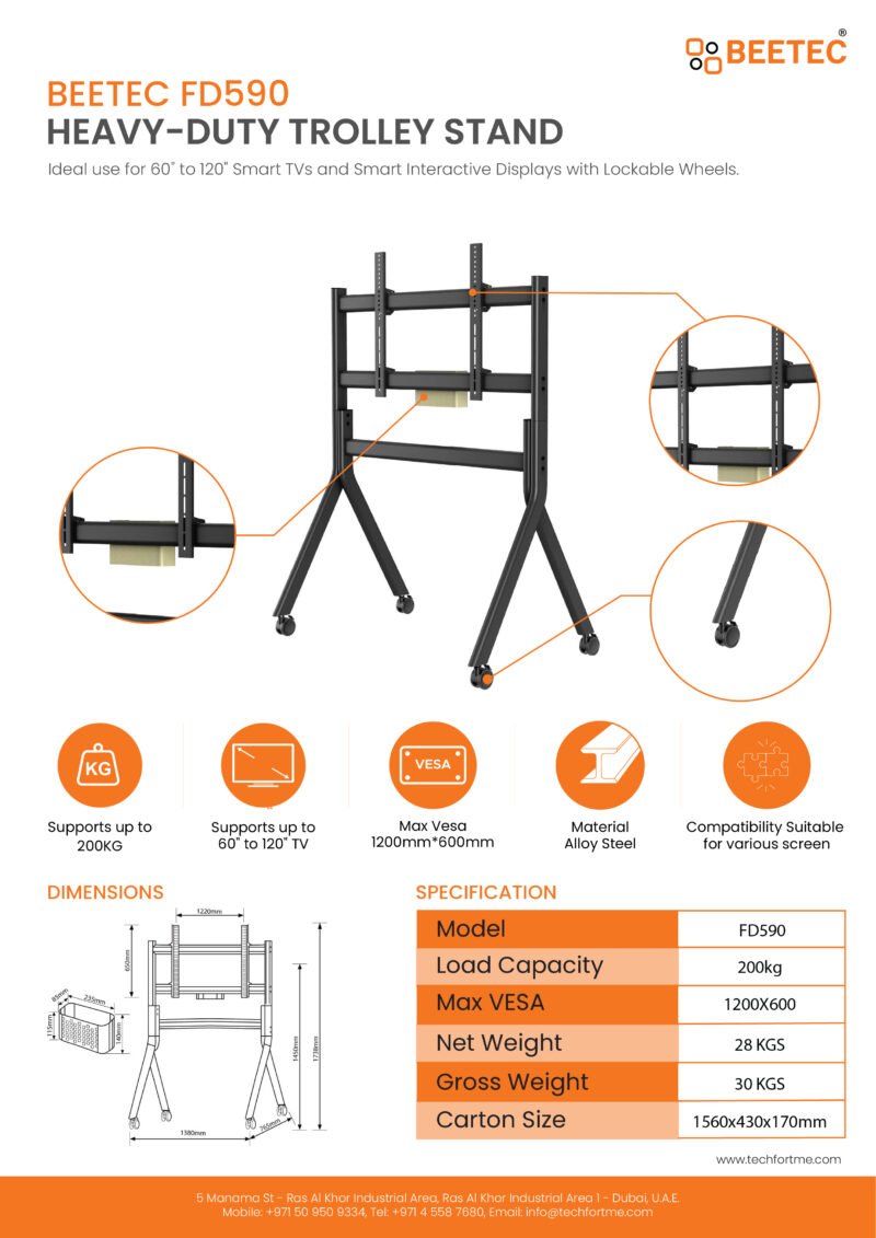 This heavy-duty mobile TV stand is designed to support large displays ranging from 86 to 110 inches. With a robust structure capable of handling up to 200 kg, it is ideal for conference rooms, classrooms, and exhibitions. The stand includes a wide VESA mounting compatibility of up to 1200×600mm, ensuring versatility with various screen types. Smooth-rolling wheels and a stable frame provide both mobility and safety.