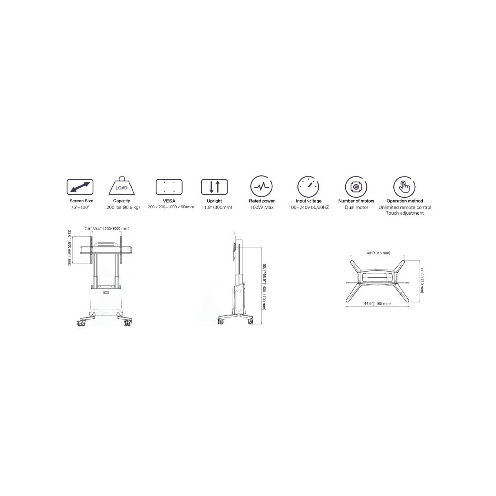 The G100 Motorized Mobile TV Cart is a premium motorized stand designed to support large displays with ease, flexibility, and stability. Perfect for conference rooms, classrooms, exhibitions, or corporate environments, this cart can hold screens from 75” to 120” and supports a maximum weight of 200 lbs (90.9 kg).