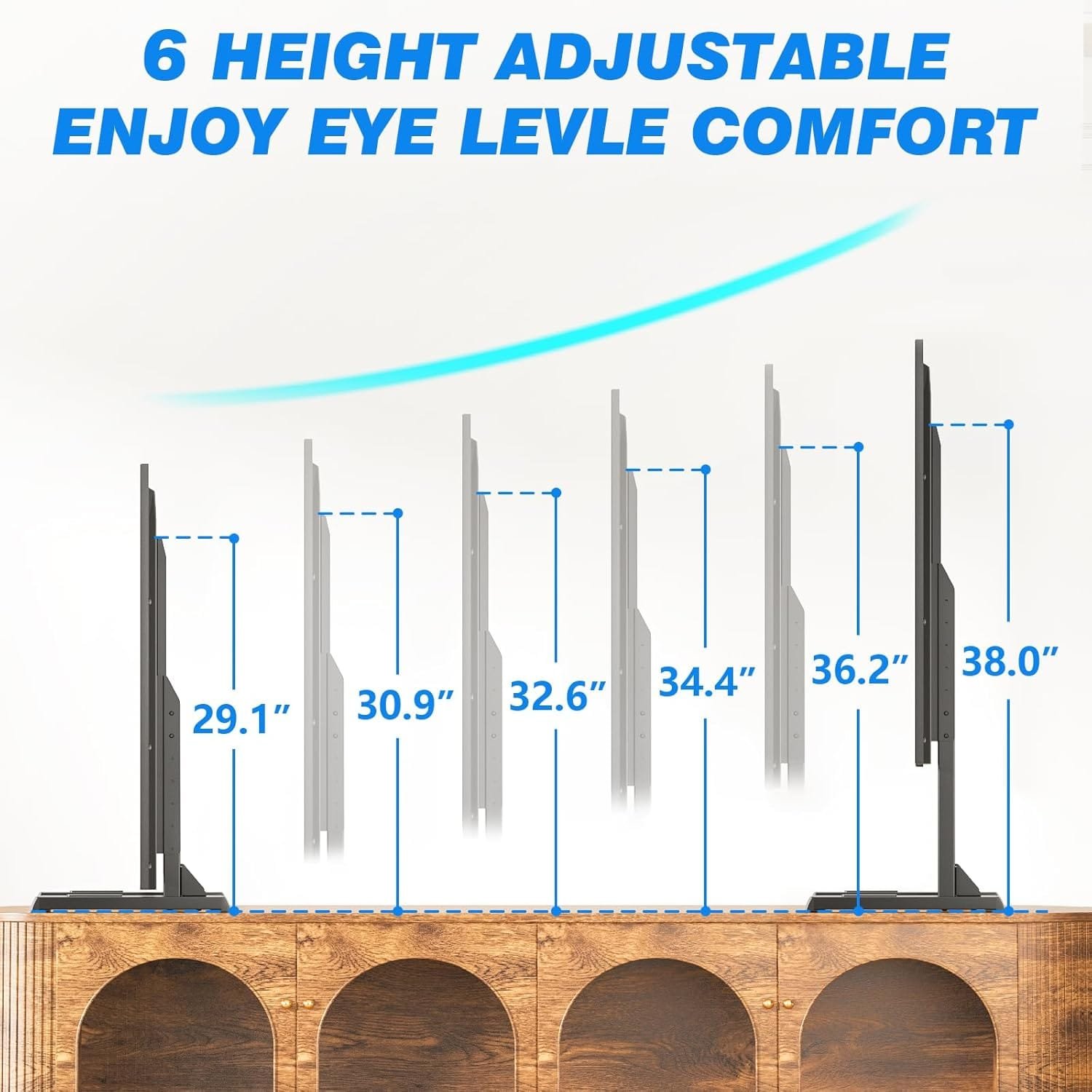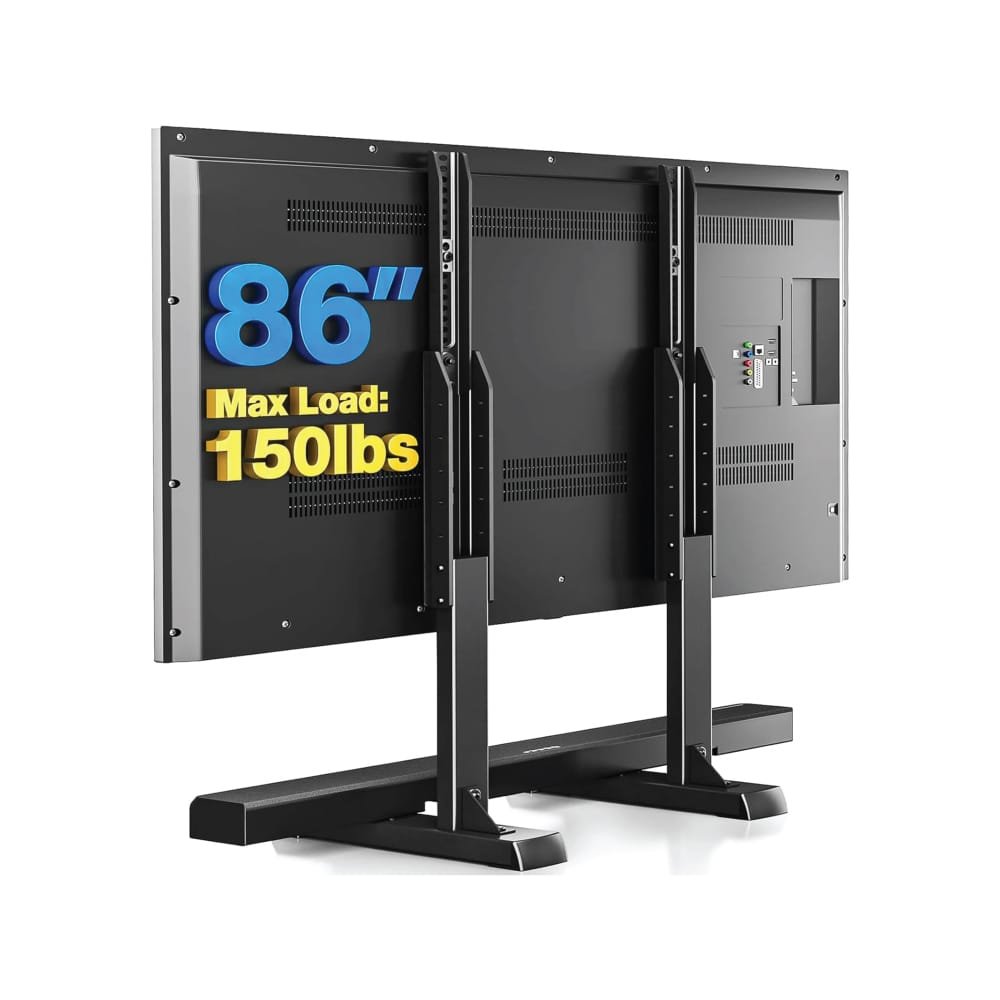 The Tabletop TV Stand UT3004 is a durable, height-adjustable universal TV stand designed for 24-86 inch TVs. Made of alloy steel, it supports up to 150 lbs with safety locks for stability. Its adjustable poles and six height options ensure an optimal viewing experience. Compatible with various brands and VESA sizes (200x200mm to 800x600mm), it includes cable management for a clean look.