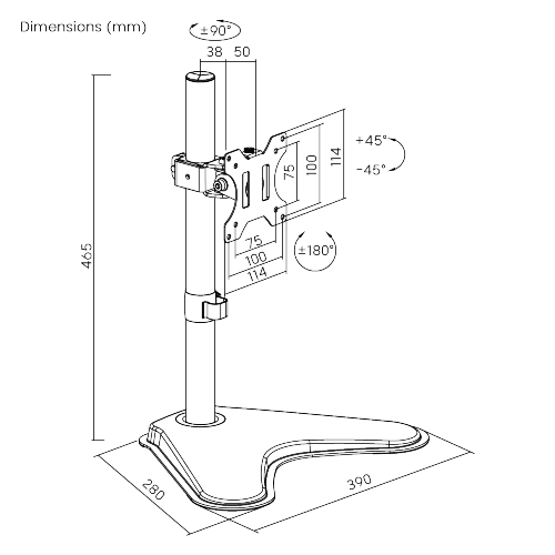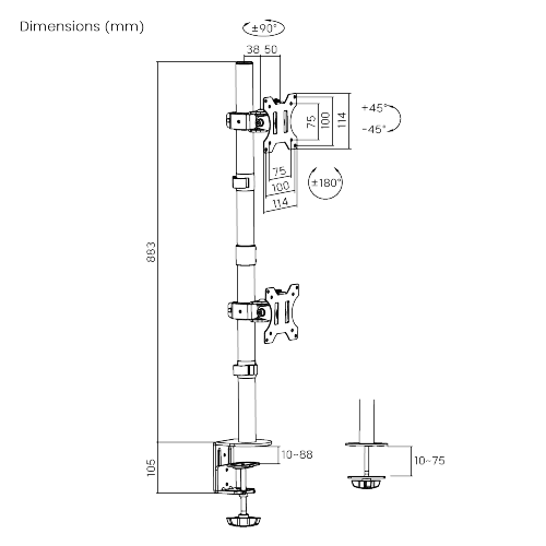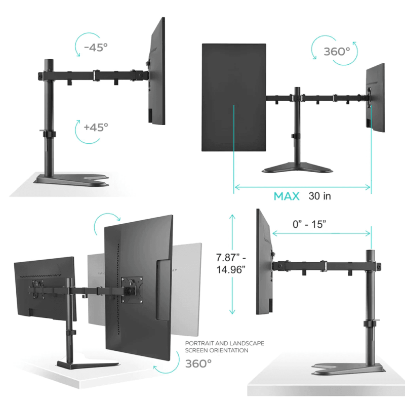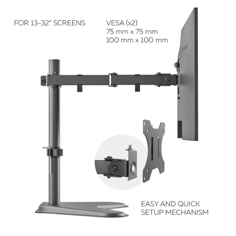 The height-adjustable dual monitor freestanding mount TF-D200 is compatible with 13-32″ screens that weigh up to 17.6 lbs each. The mount supports two most popular VESA configurations among computer monitors – 75 mm x 75 mm and 100 mm x 100 mm. The unit comes equipped with a cable management clip which can also hold the Allen wrenches that are used for tilt/swivel adjustments and are included in the set.