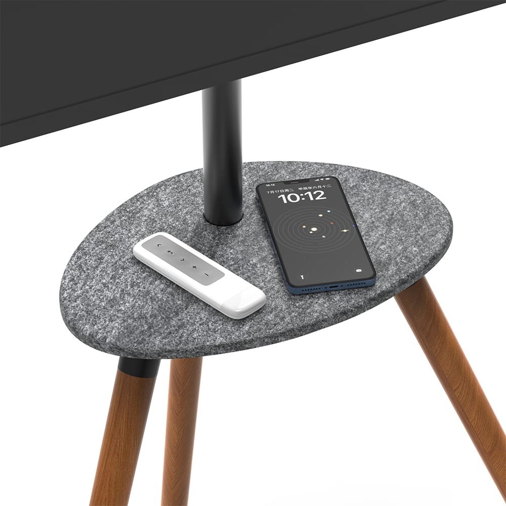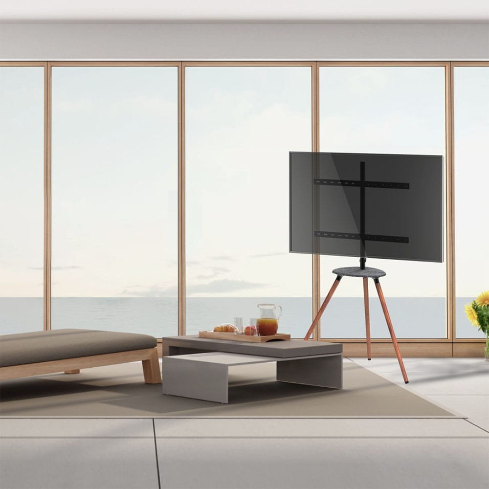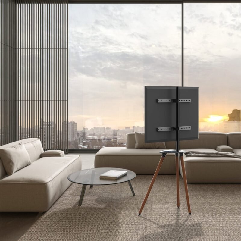 The TF-FS64B TV floorstand with beechwood and a tray. This tripod floor stand has a beautifull design and the beechwood gives it a warm look and is suitable for medium and large flat screen TV’s. The TV can swivel for the best viewing position. The flat screen has a maximum VESA 600x400mm. This tripod TV stand can fits most 45″-65″ TV panels and a maximum weight capacity of 40kg.