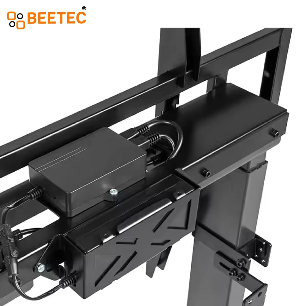 This motorized TV cart is designed for versatility and convenience, accommodating most 55″ to 100″ TVs. Engineered with robust aluminum, steel, and plastic construction, it offers a sleek matte black and white finish that blends seamlessly into any environment. The cart’s design includes an adjustable height feature, providing a range of 920mm to 1600mm (36.4″ to 63″) to ensure optimal viewing angles, whether in a professional setting or a home theater.