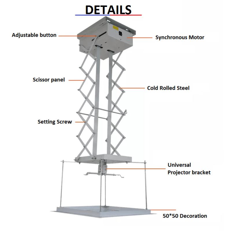 Crafted from high-quality aluminum alloy and cold-rolled steel, the lift ensures durability and stability while maintaining a sleek, discreet design. Its adjustable height and customizable drop length make it suitable for a wide range of ceiling heights and projector sizes.
