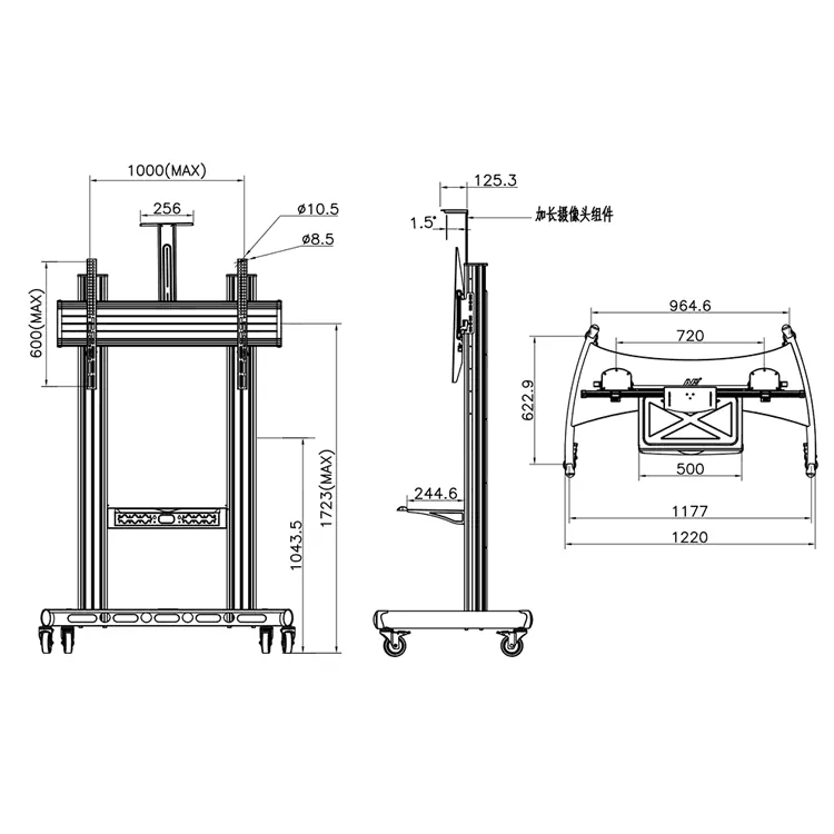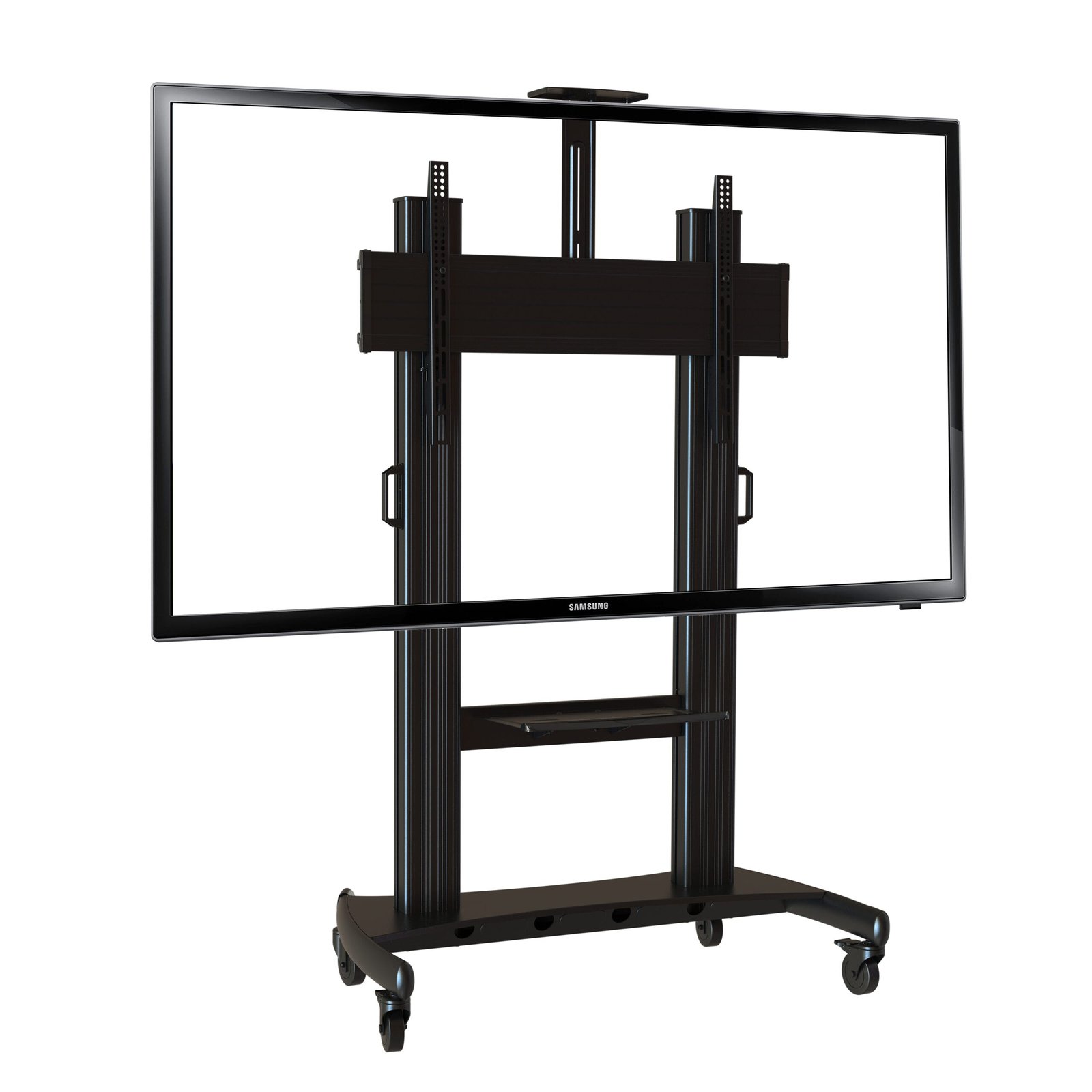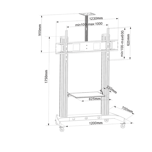 The steel heavy-duty TF-T1800B is perfect for TVs that fit a maximum weight load of 150kg/330lbs. Also has a competitive cost. The wall plate can be adjusted for the ideal viewing height. The convenient AV support shelf organizes and maximizes your space—holding up to 20kg/44lbs, it’s the optimum place to stow all of your AV equipment, laptops, and more. It provides a solid, yet moveable, foundation for oversized TVs. The four-locking casters provide you with the best mobility as well as the utmost stability.